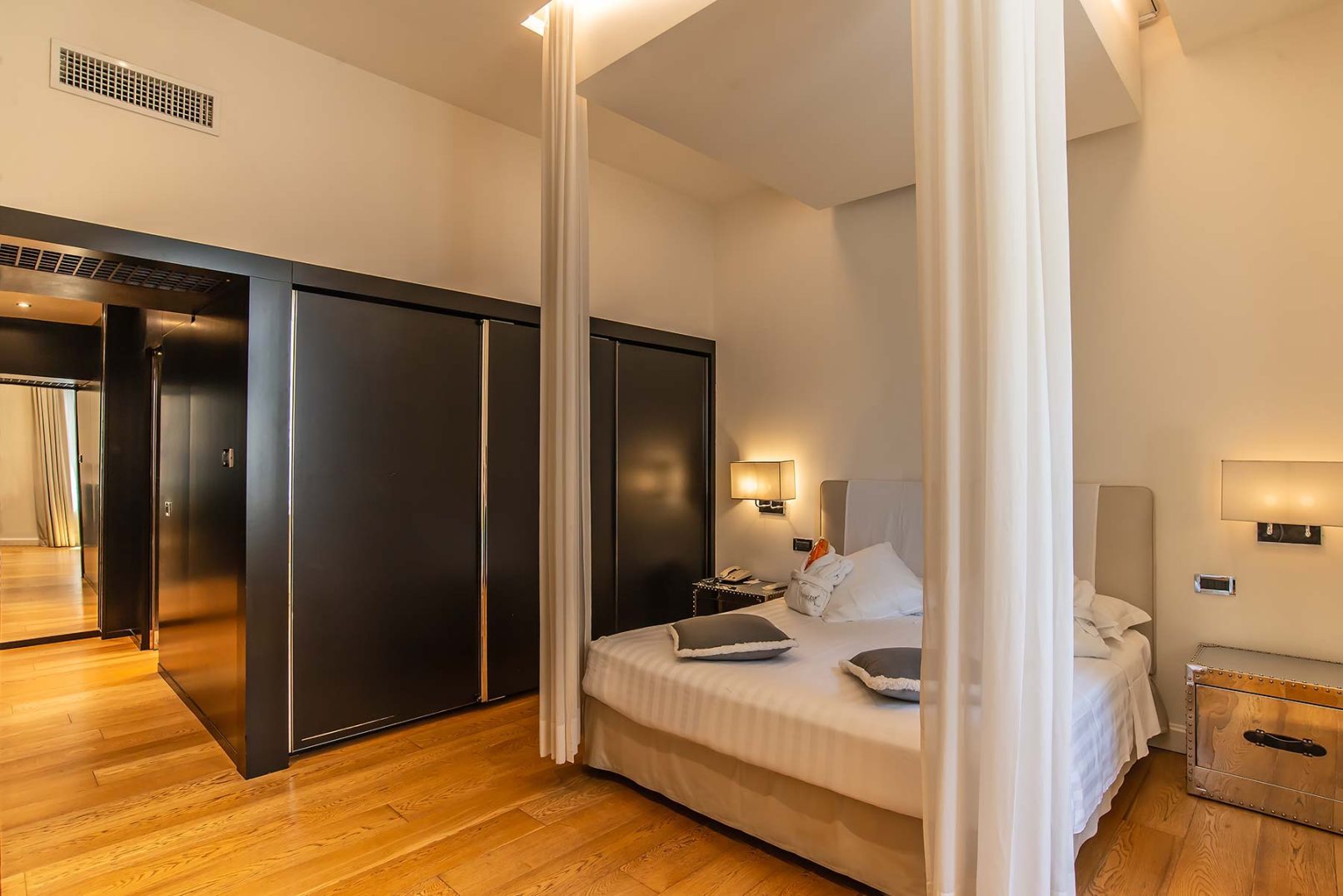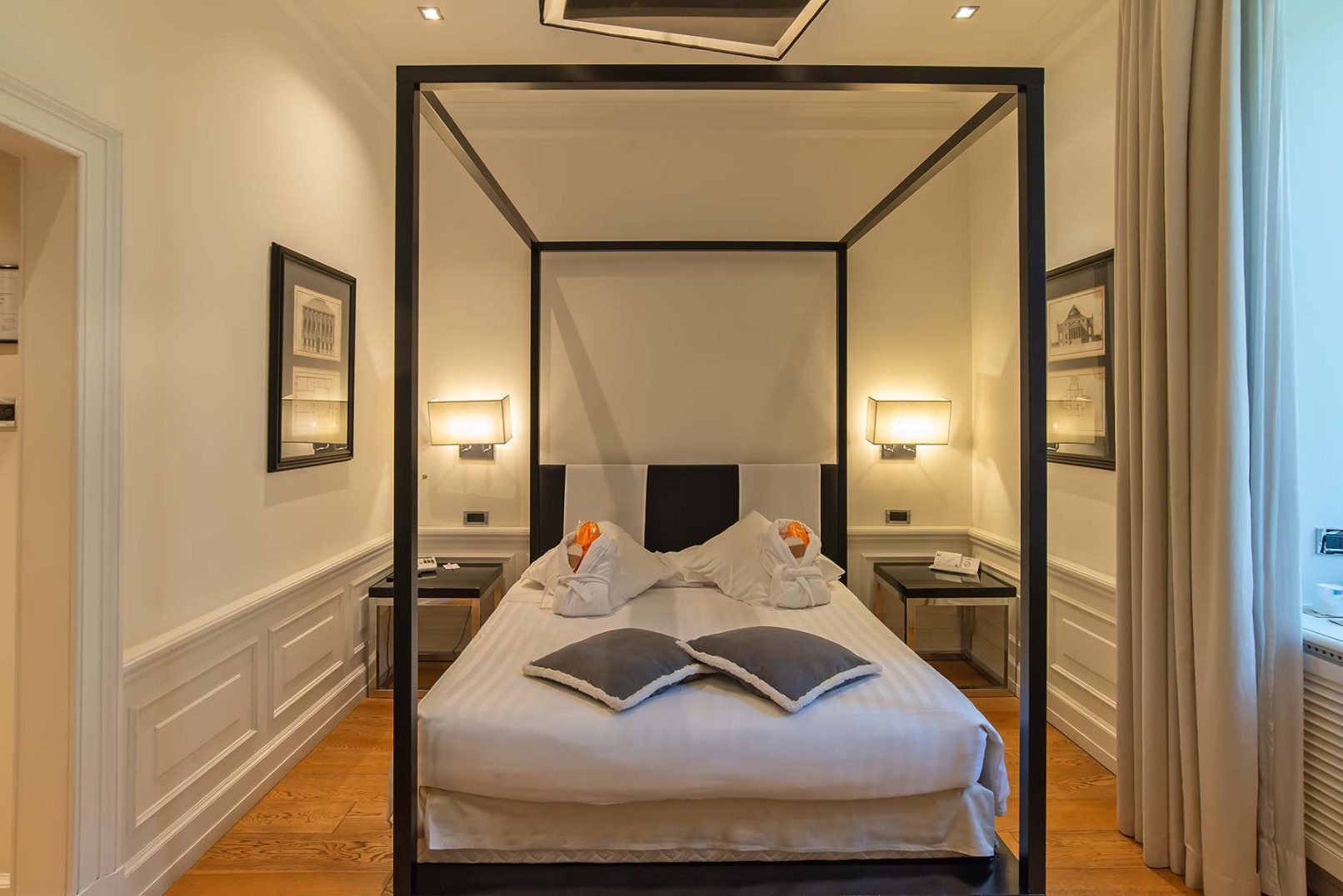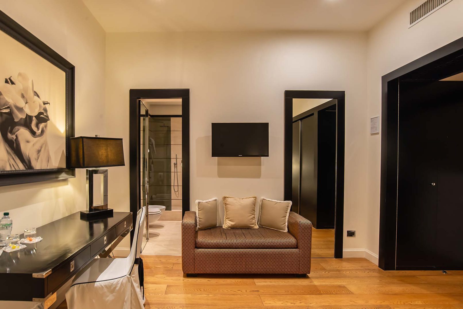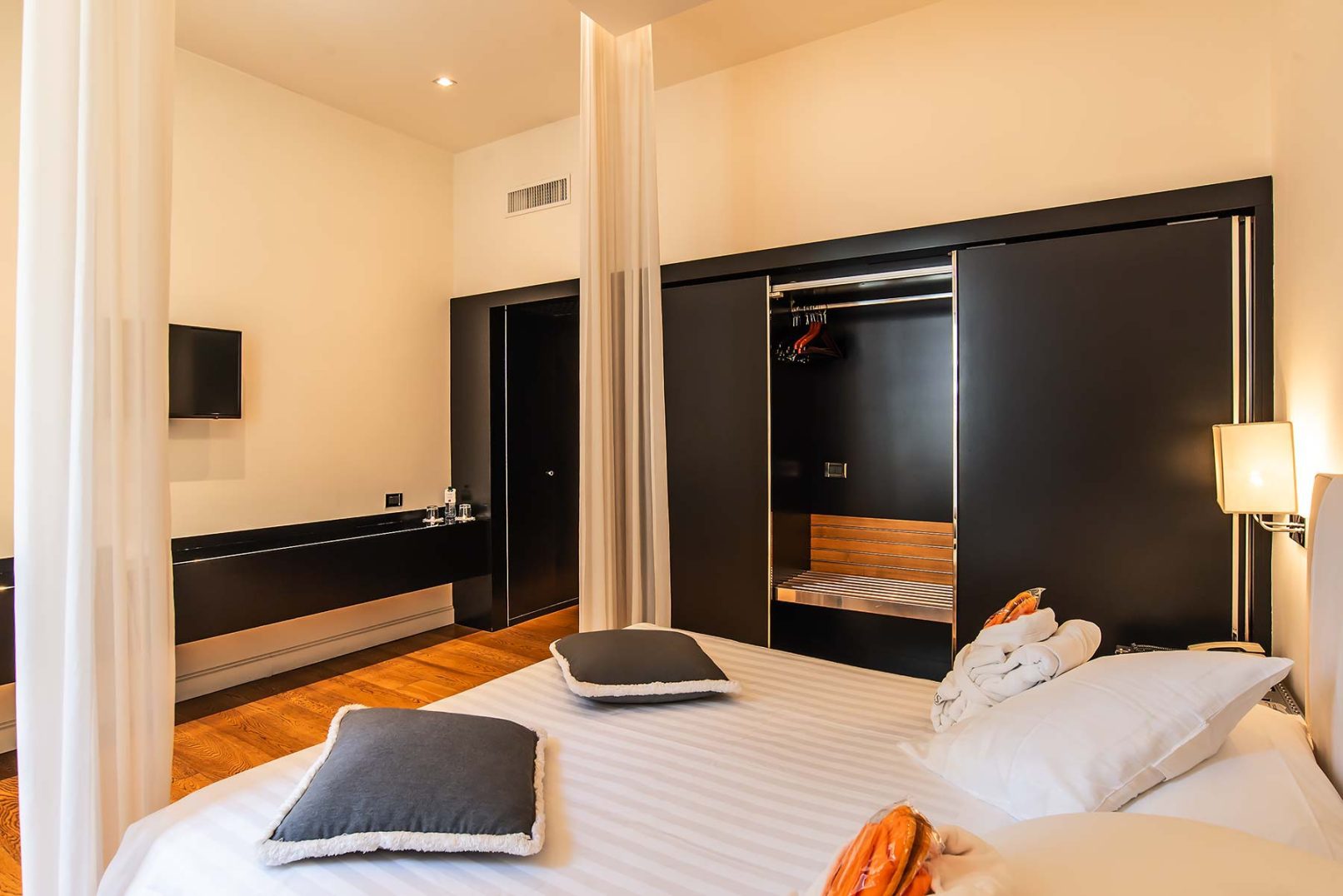 Deluxe rooms feature a modern design and sophisticated black and white furnishings.