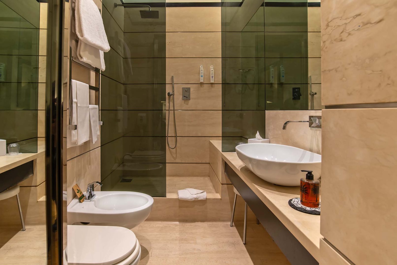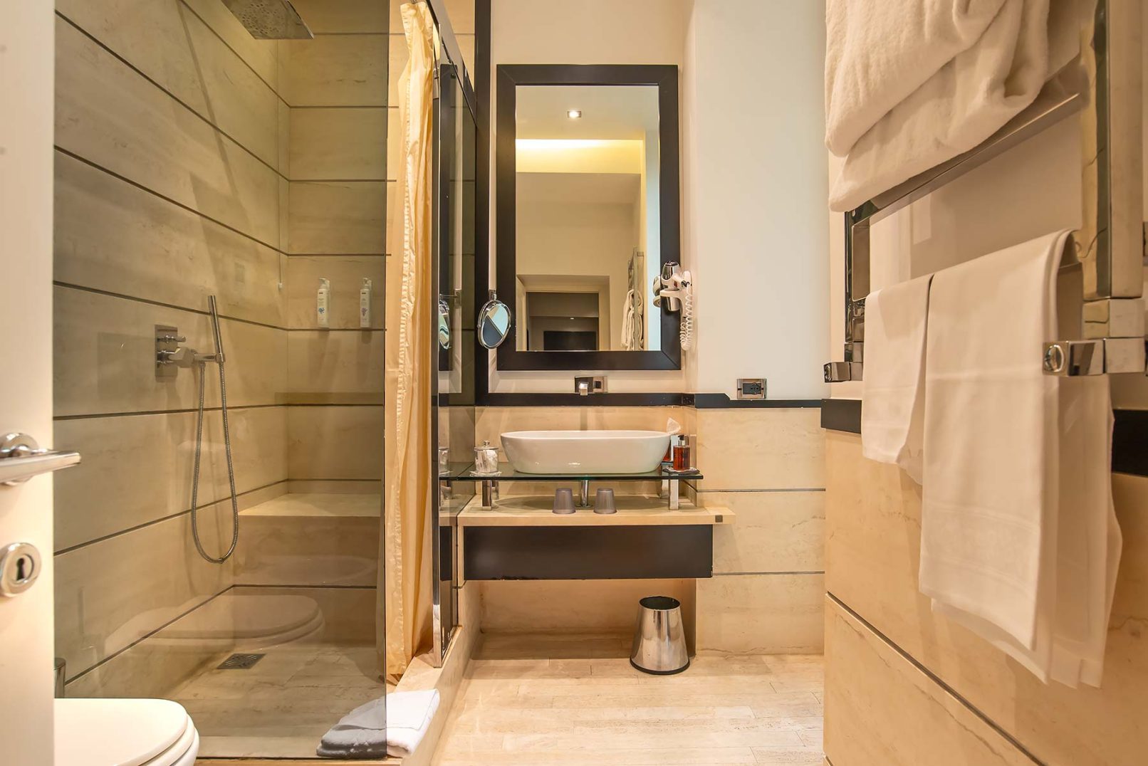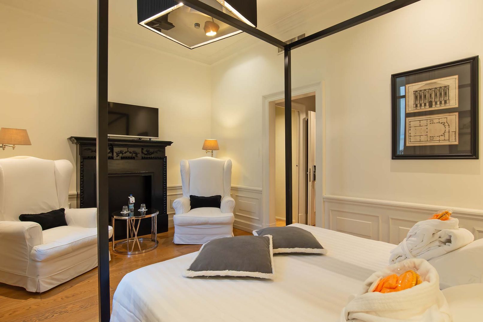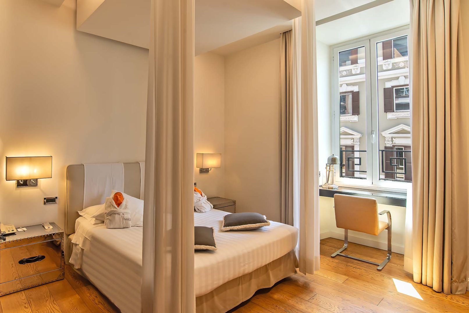 Deluxe rooms feature a modern design and sophisticated black and white furnishings.